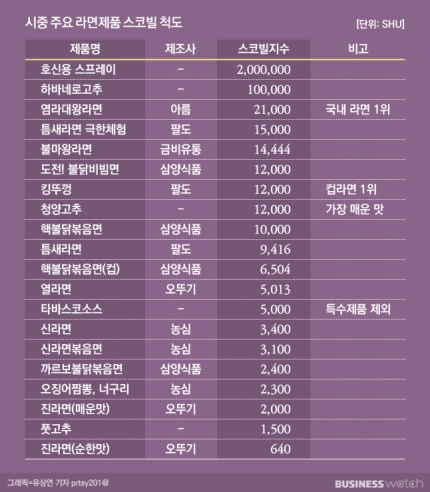 그래서 맵기를 측정하는 스코빌지수를 기준으로 현재 우리나라에서 출시되는 라면의 스코빌 지수를 정리한 자료를 찾아봤습니다.